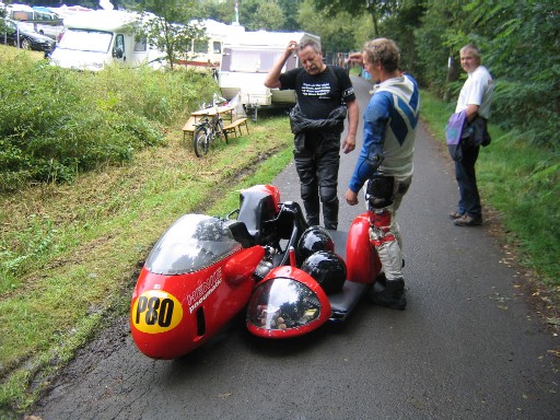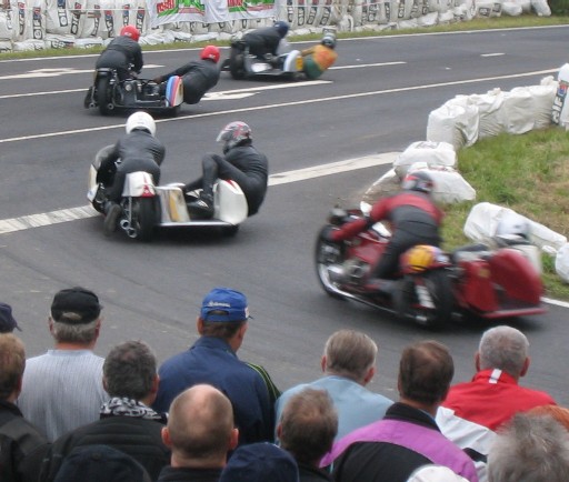 Ein Linksseitenwagen-Gespann in der Rechtskurve: der "Schmiermaxe" belastet das Hinterrad, damit es nicht durch die Fliehkraft abhebt.